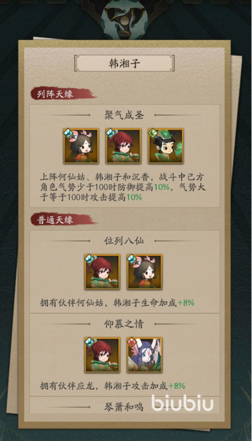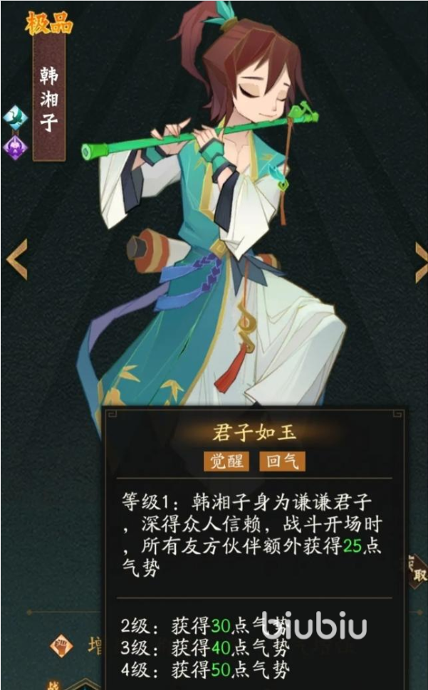 先来对韩湘子做一个基础的了解吧,韩湘子的角色定位是辅助位,他是一个道士,所以说玩家们想用他来打输出位置的可能性比较小,战斗过程中的主要作用是对己方队友进行群体性的增益,同时增益效果较强。