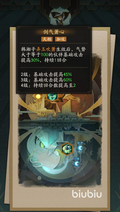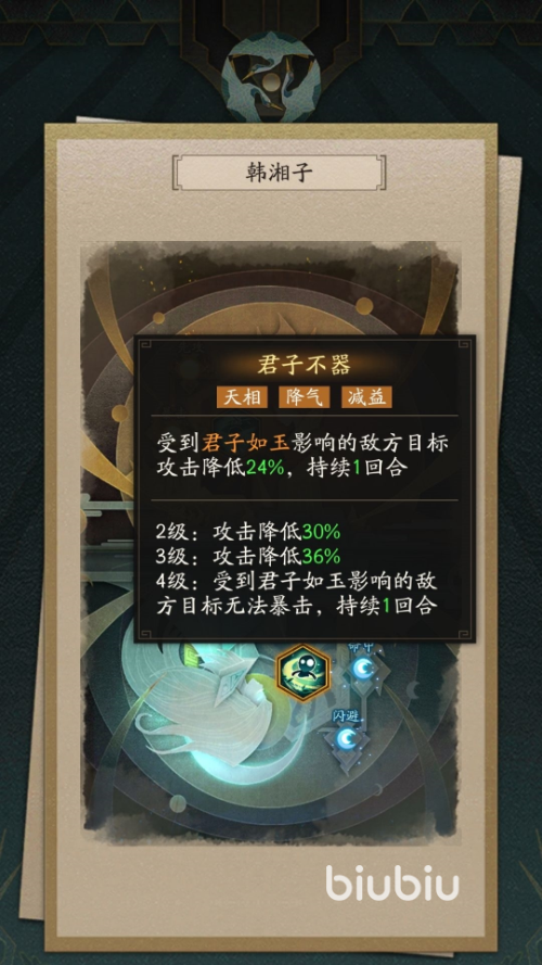 韩湘子的觉醒技能叫做弄玉吹箫,这个技能启动之后首先获得的一个作用就是提高自己的生存时间,为自己防御,同时会提供给场上每一名队友额外50点的气势值。君子不器是韩湘子的天相效果,发动这个天相的时候会同时出发被动。