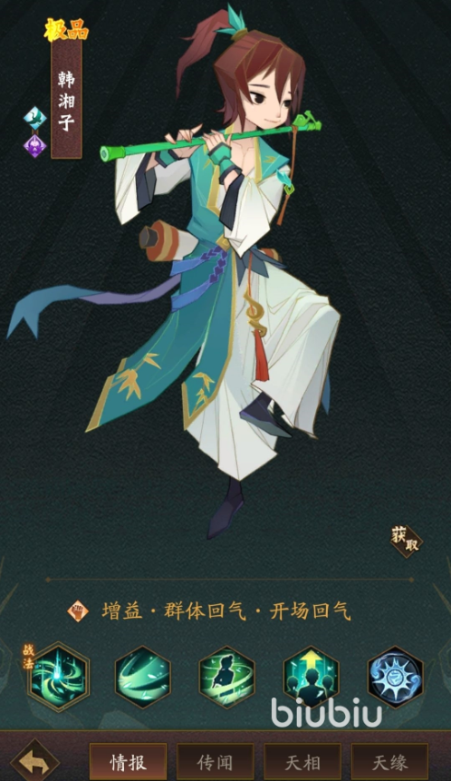 韩湘子是道士嘛,所以韩湘子的战法是道教的天花引,这个战法的效果是增益,当这个技能启动之后,韩湘子会拿起武器萧进行吹奏,吹奏的时候对己方的全体队友进行鼓舞,这个鼓舞会持续两个回合,鼓舞会提升队友的气势,队友会增加自己本身额外的气势,提高战斗力。