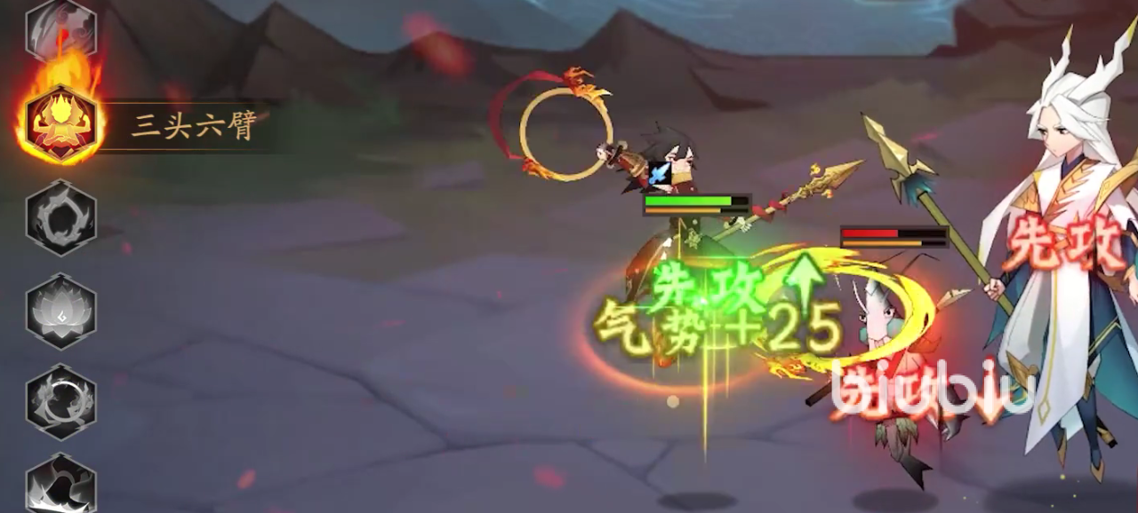被动技能,哪吒的被动技能风火轮可以让哪吒获得速度上的优势,每回合开始之前可以额外降低敌方5%左右的先攻值,提升自己5%的先攻,最多可以叠加到10%,并且哪吒还可以额外回复十点气势。等级升满之后,一下子最多可以恢复25点气势,更容易攒出大招。