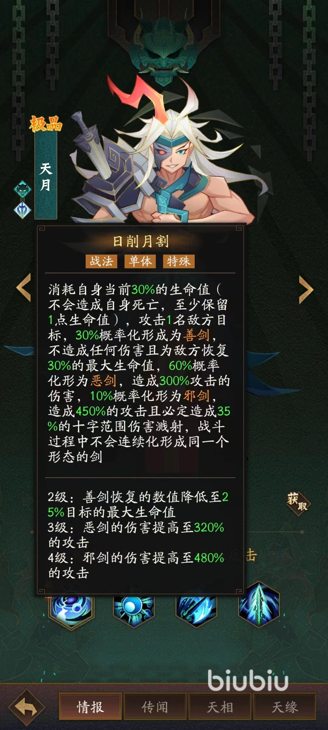角色及其擅长单体攻击,并且在形势危急情况下拥有绝地反击能力,战法特点是消耗自身大量生命值,但是不会造成死亡,最少能保留一点血量。消耗生命之后攻击一名敌方目标,接下来会进行判定,有百分之三十几率为善剑,不会造成伤害并且为敌方回血,百分之六十几率为恶剑,造成一次极高伤害,还有很小几率化行为邪剑,伤害更高而且会触发溅射。该技能简单理解,就是比较看脸,如果运气好生成邪剑,将会给敌方造成很大的打击。