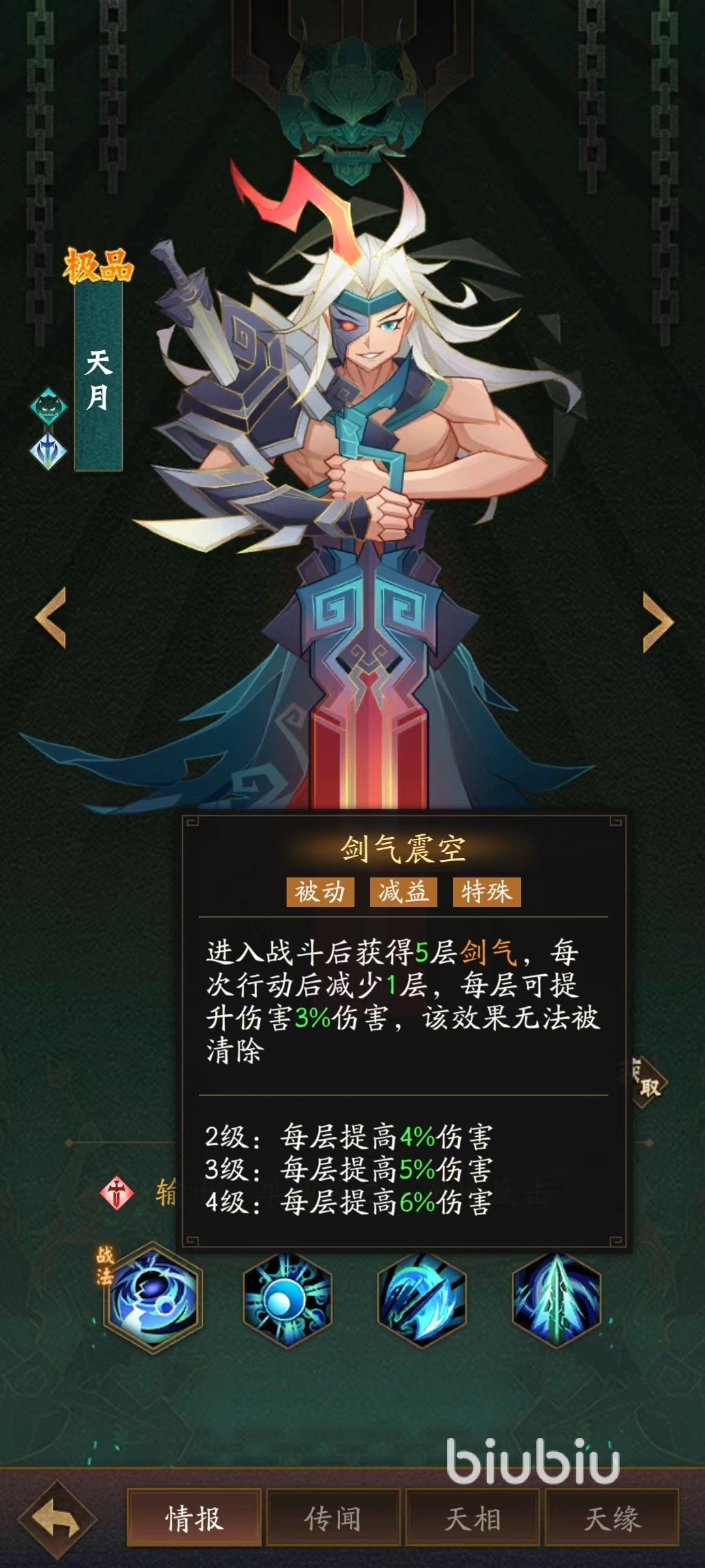 接下来是几个被动效果,剑气震空,在介入战斗后直接获得5层剑气,每次行动后会减少一层,层数越高提升伤害也就越高,属于前期就能打出小爆发的类型。第2个濒灭之刃,在自身生命值首次降低到20%以内时不会立即阵亡,而是释放一次战法效果,本次释放不会在额外消耗生命值和气势。极其强悍的单体输出能力,即使在后期也毫不逊色。