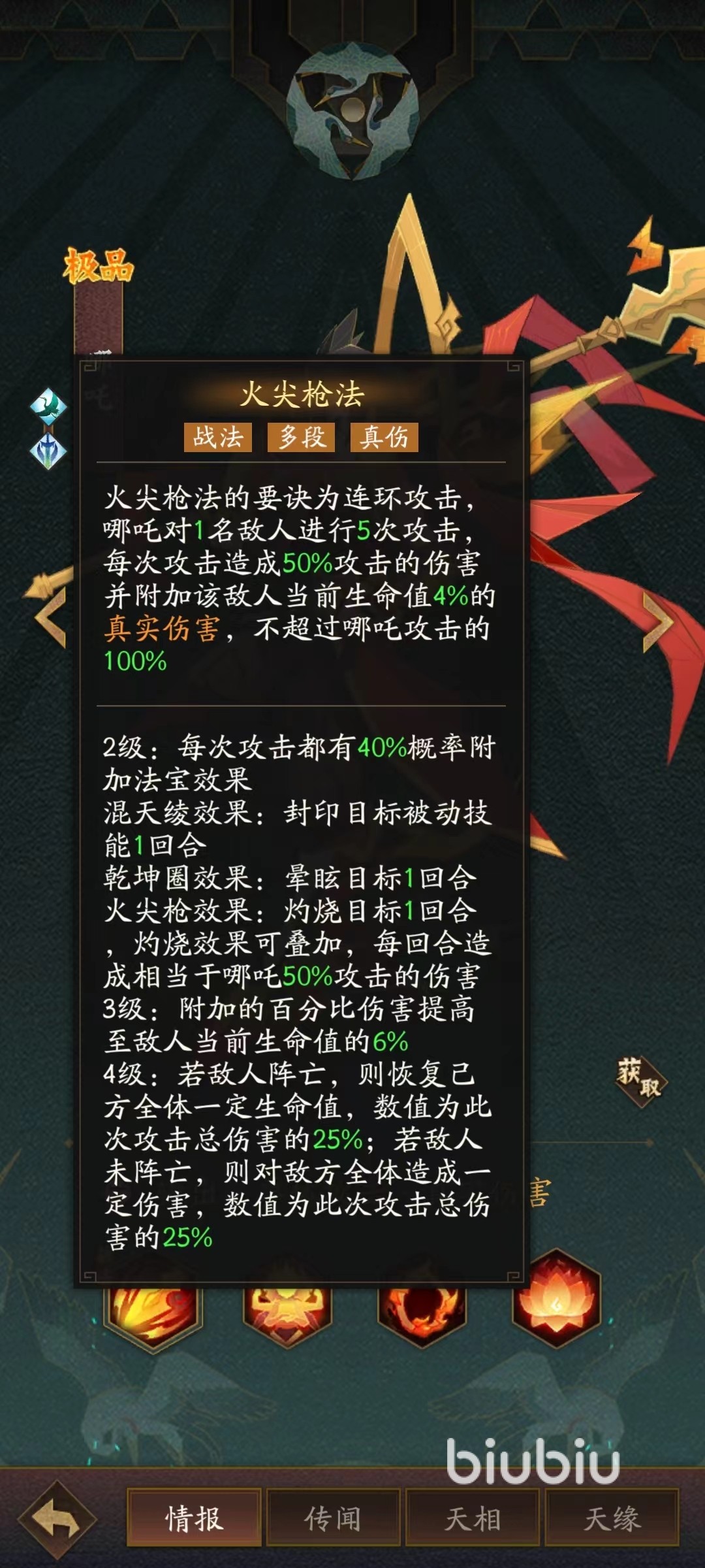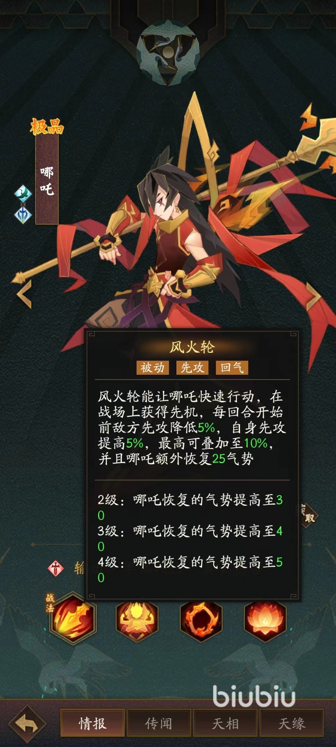 哪咤极其擅长单体攻击,还拥有真实伤害,这是其最大特点。战法火尖枪法,连续攻击一名敌人,每次都会附加真实伤害,对于肉盾有着很好的效果。后来还会附加眩晕灼烧以及其他各种效果,如果攻击敌人时敌人阵亡,则能为我方全体恢复生命值。被动主要包括三头六臂,风火轮和莲花化身。风火轮让哪咤能快速行动,在战场上率先出手,每回合开始时先降低敌方先攻值,提高自身先攻,通过叠加不断强化自身。