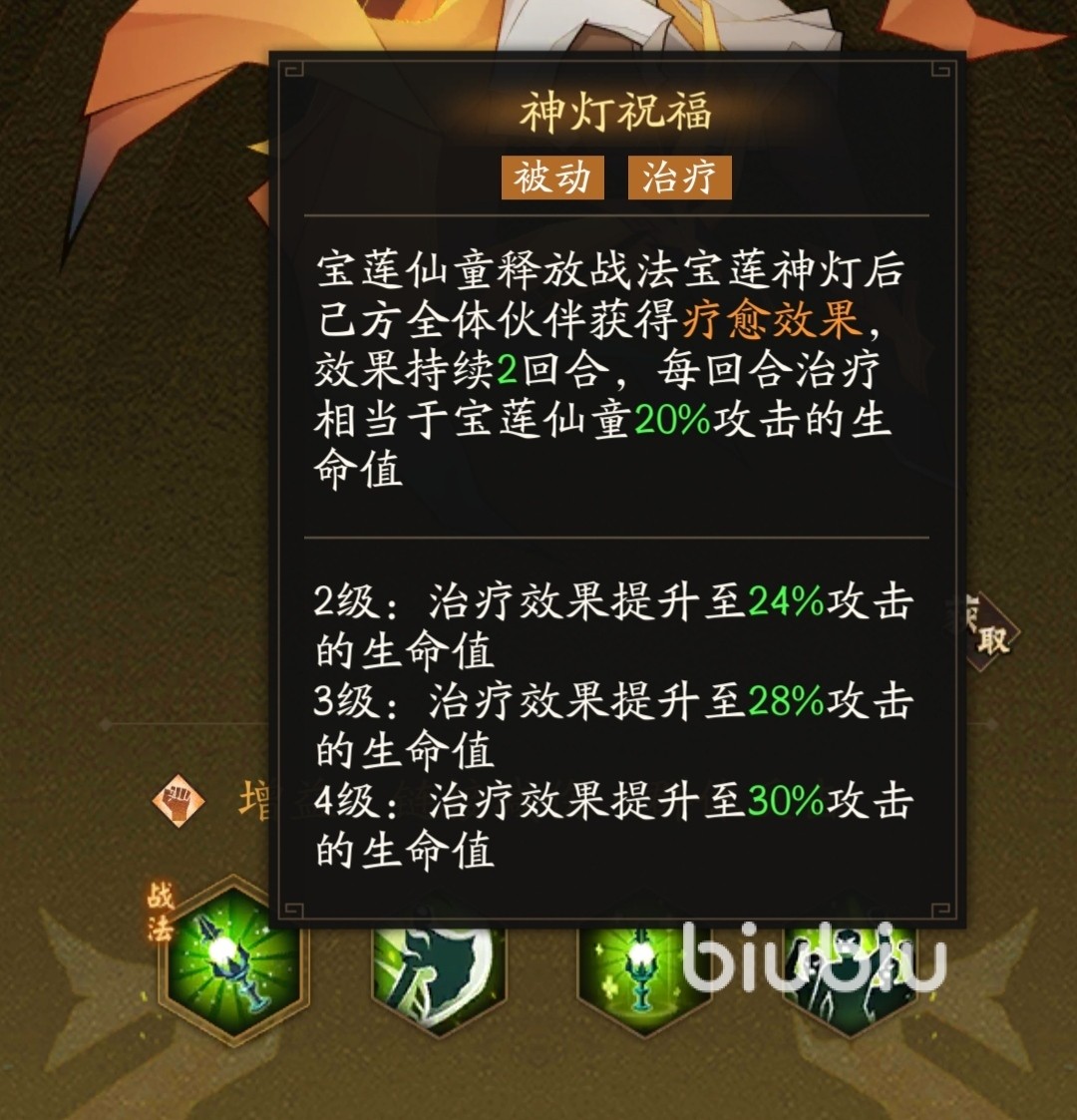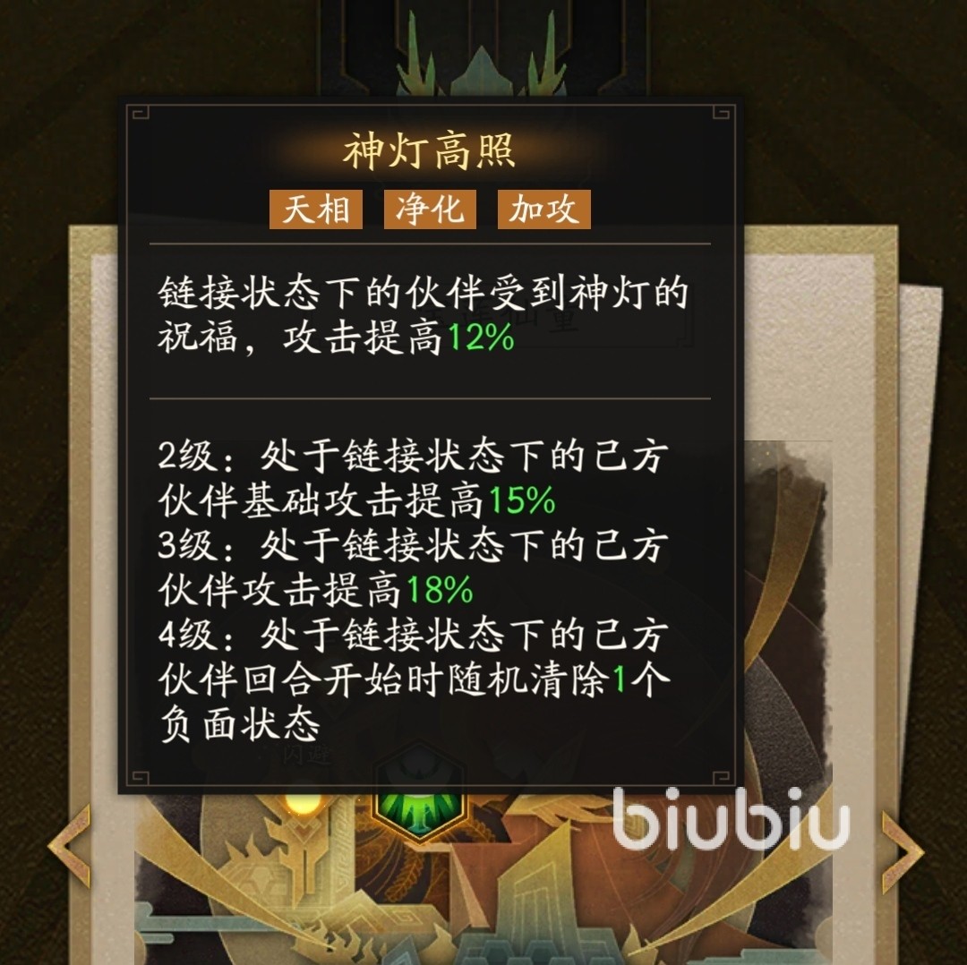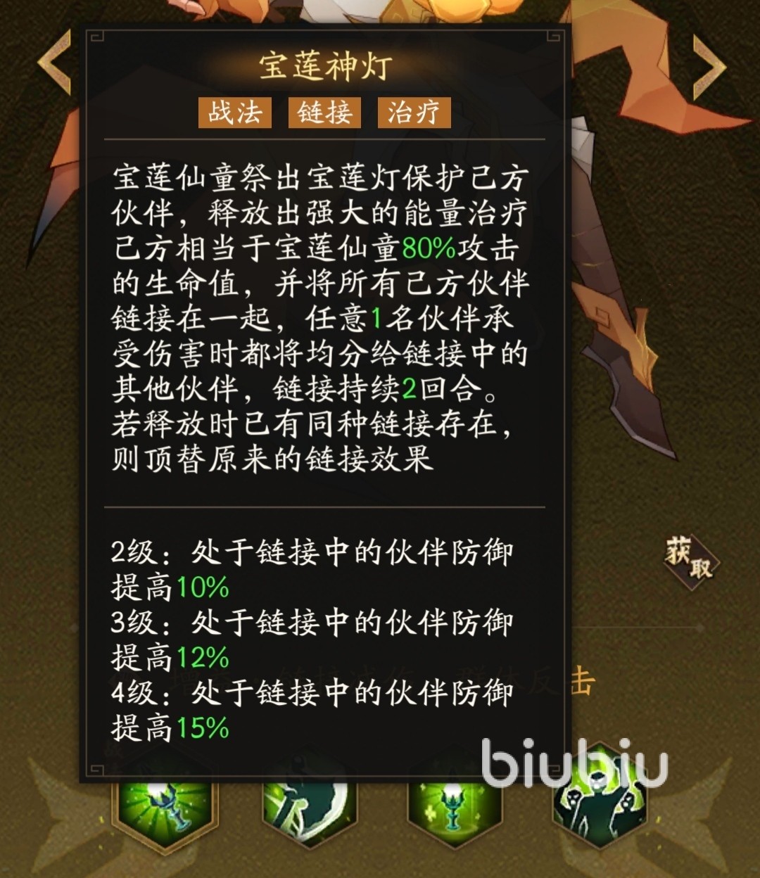 这便是他的大招了,在使用之后角色会释放出宝莲灯来保护自家人员,同时会施展出大量的能量来为其进行治疗,而这里可以为其恢复的血量是根据角色的攻击力来判定的。同时会将自家所有人都链接在一起,到时候只要其中一名人员受到攻击,那么此次攻击所产生的伤害就会平均的分给其他人员,而这个效果会持续两个回合。如果在使用的时候已经有了链接的存在,那么它就会进行一次刷新。