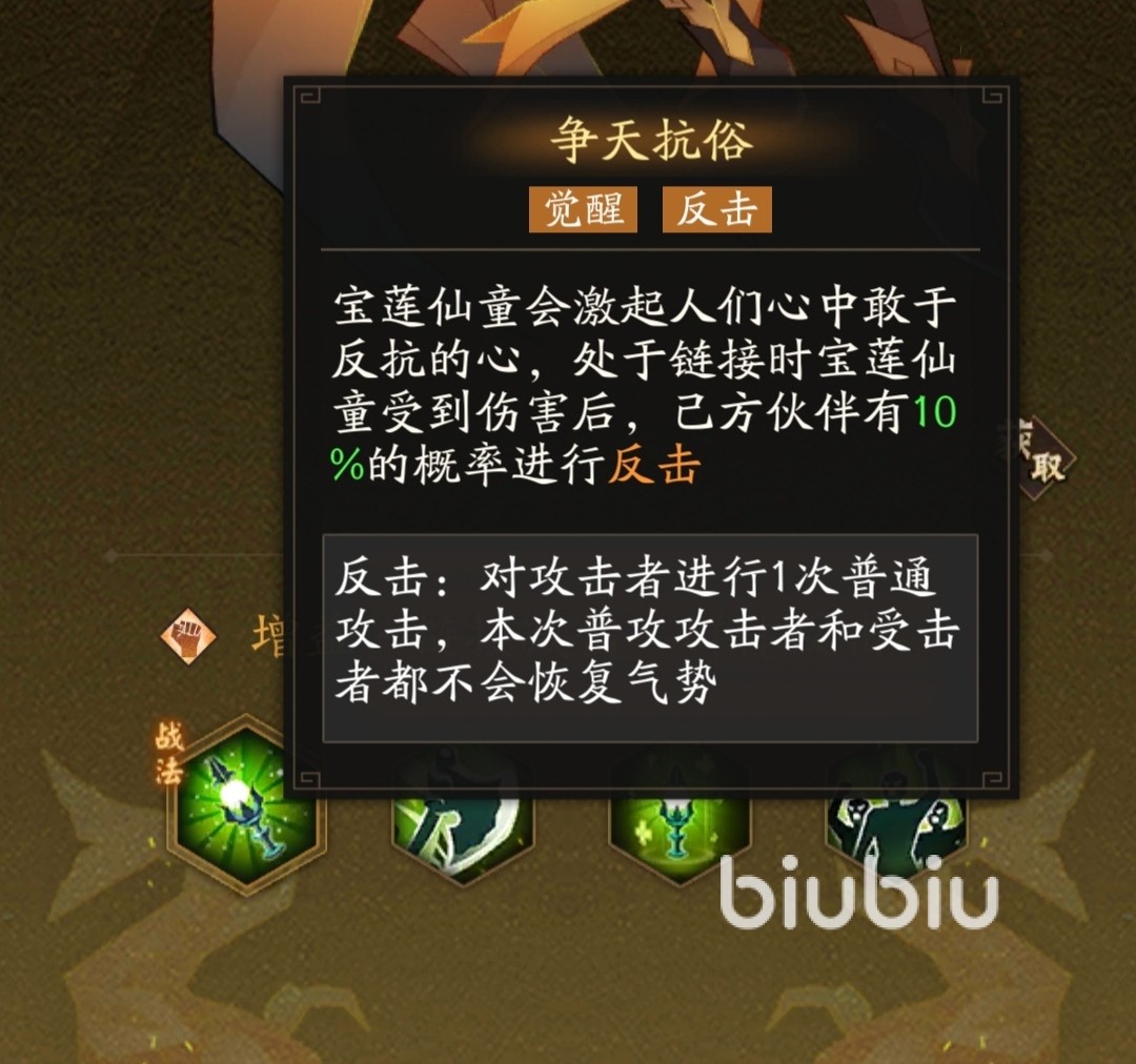 这是一个加成技能,因为此人本身的设定就是一个勇于反抗的形象,所以与其同队的人也会被激发这样的心理。而这个能力的主要功效是,处于链接状态的这个角色受到伤害时,自家人员就会有一定的几率进行反击,这个会对攻击者产生以此普攻伤害,不过这次普攻是不会恢复气势值的。