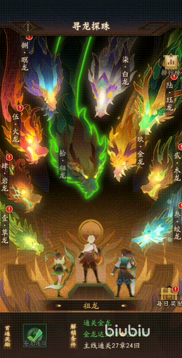 最后是游戏的各种活动玩法,每一种活动的规则和奖励都不一样,这些活动有常驻和限时两种,下面要给大家介绍的是游戏中的常驻活动,首先是第一个仓颉梦境活动,这个活动需要玩家去挑战各种关卡,之后在关卡中收集字灵,拿到后大家就可以在仓颉仓库中用字灵兑换共鸣材料、升级材料等等道具。之后是一个叫做寻龙探珠的玩法,这个玩法中大家需要完成龙神试炼,一共有十条神龙,玩家会从草龙开始到祖龙结束,完成龙神试炼之后,玩家就能获得龙珠奖励。