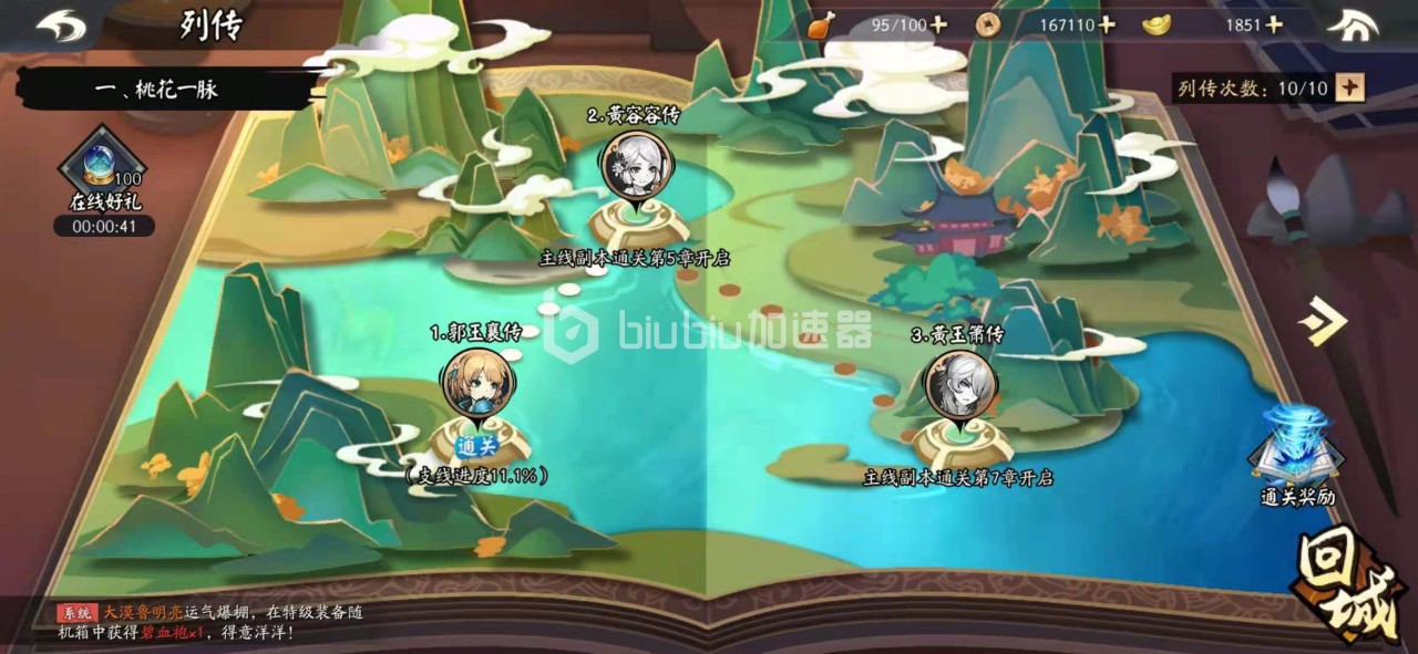 当我们第一次进入游戏之后,我们就可以开启江湖频道。江湖频道里面有不同的地域,我们可以攻打每一个地域,然后地域里面的关卡都是新的,第一次通关的话,可以获得更多经验。所以我们想要快速升级的话,就要不断的去打最新的关卡。像一些老旧的关卡,就不需要再费力的重新打了。