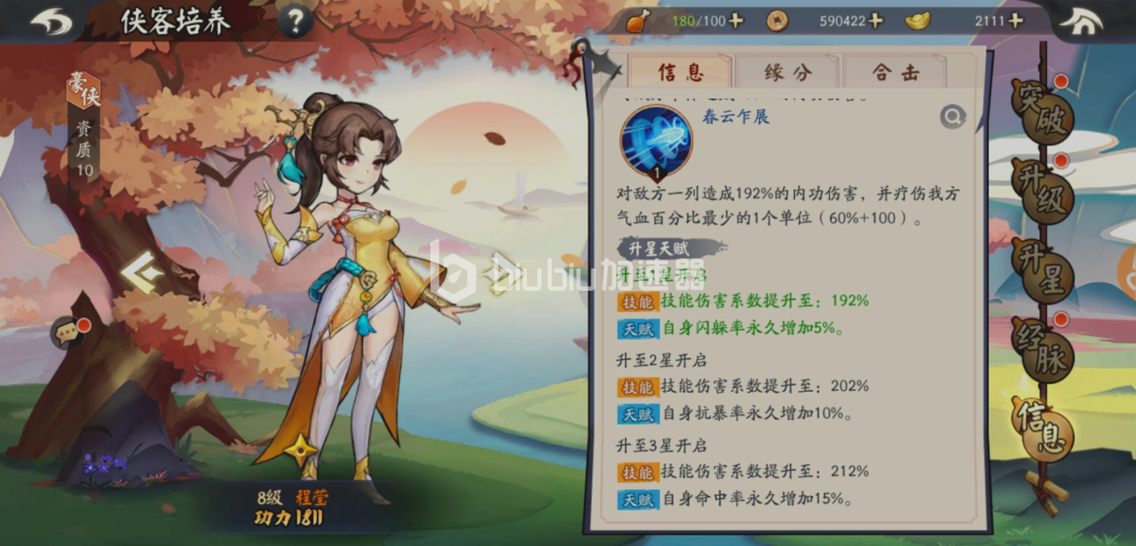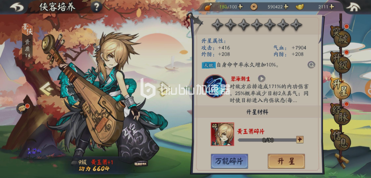 大招是对敌方后排产生{内功}伤害,有25%的概率减少2点真气,同时使目标进入内伤状态,在两回合内,每回合扣除等于黄玉箫40%攻击力的血量。