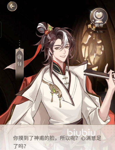 在针锋相对,灶神与朱雀和暗道中选择“看回去”,“没听到”,“无论什么时候”,可以增加与司铎的10点亲密度,在暗到深处先选择“敲他额头”,再选择“捏他耳朵”,可以分别增加司铎的3点和5点亲密度,在神明害我中选择“直接问”,增加和司铎的3点亲密度。
