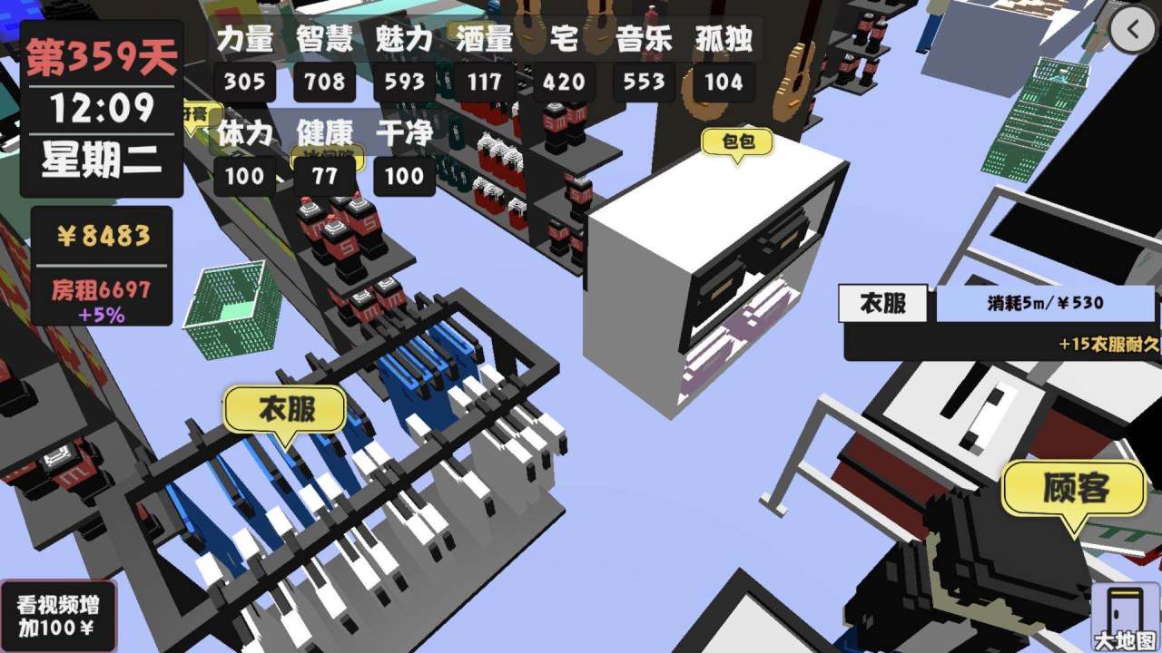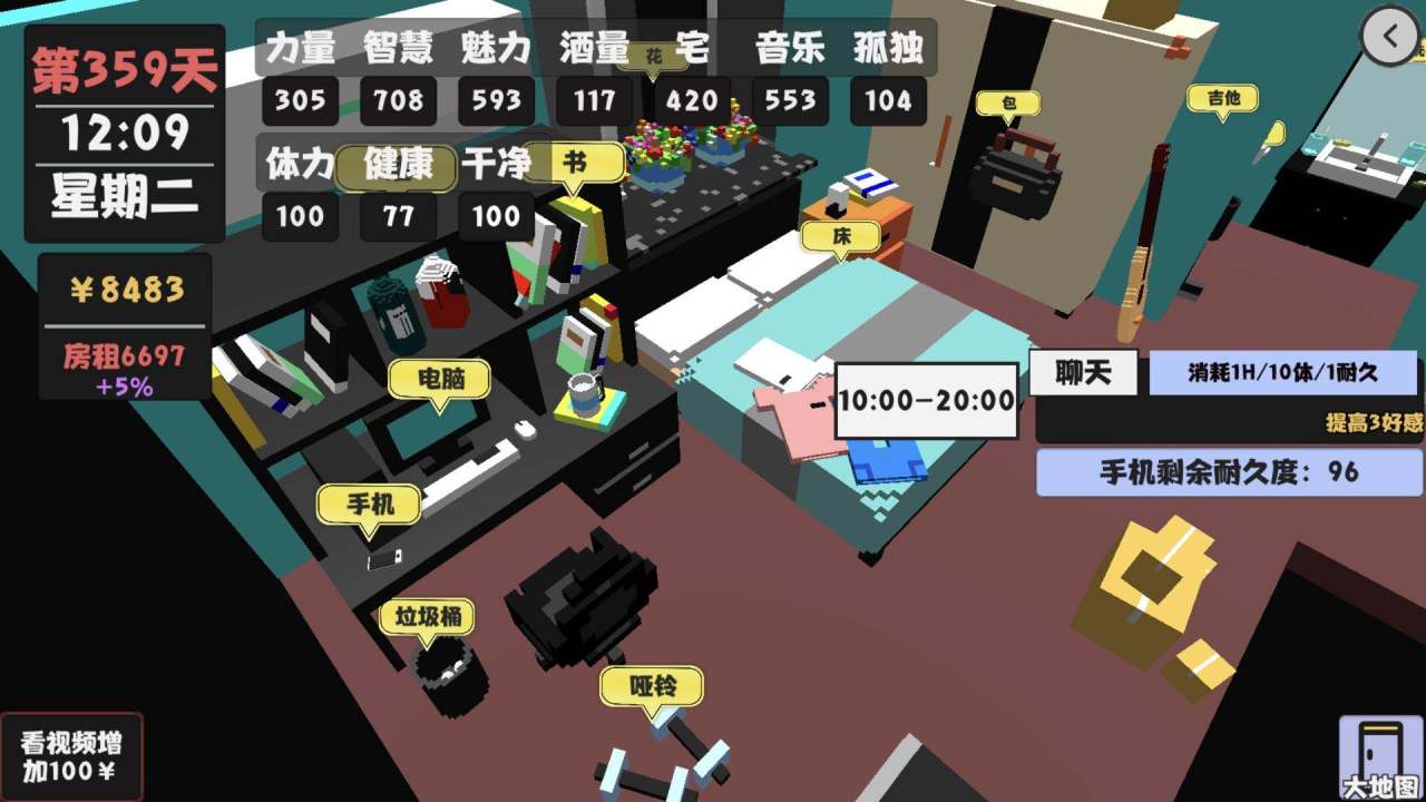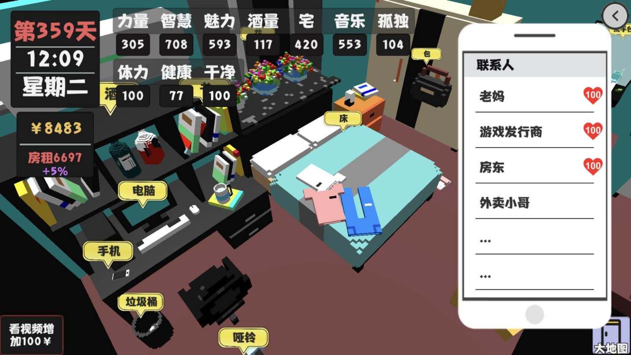 月底做游戏去给房租,把好感度刷满,其他的时候就去做视频,视频可以慢慢积累金钱,只要视频的数量和人物的智慧、宅等能力值够。