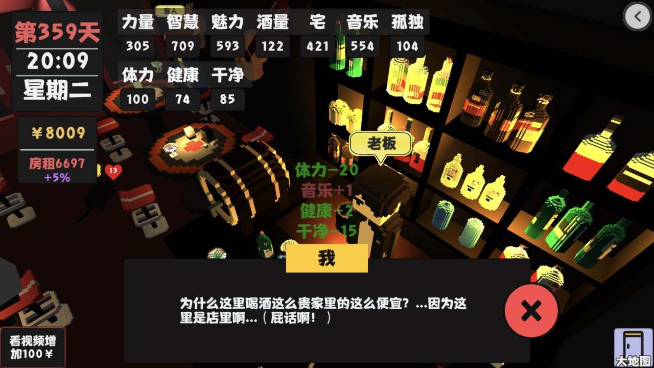 3.去酒吧喝酒提高酒量到100点,酒量50点的时候可以请小梅喝酒增加5点好感,几天就可以带回家了。酒量100点的时候可以和房东打电话,这样就能降低我们的房租。