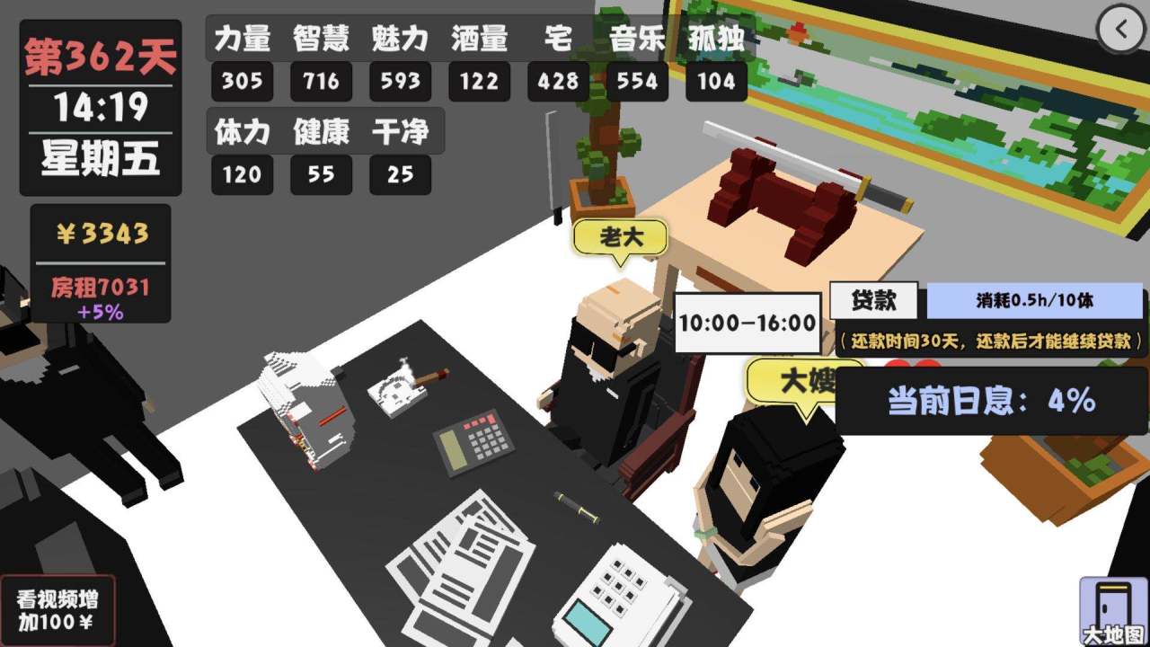 这么做的目的是凑够3000的房租,游戏发行大概有1000元,加上老妈的1000和原始的钱,第29天的时候去借贷所可以把不够的钱借出来,但是有钱了马上去全额还款,这个利息不是一般的高。(保证第一个月存活)