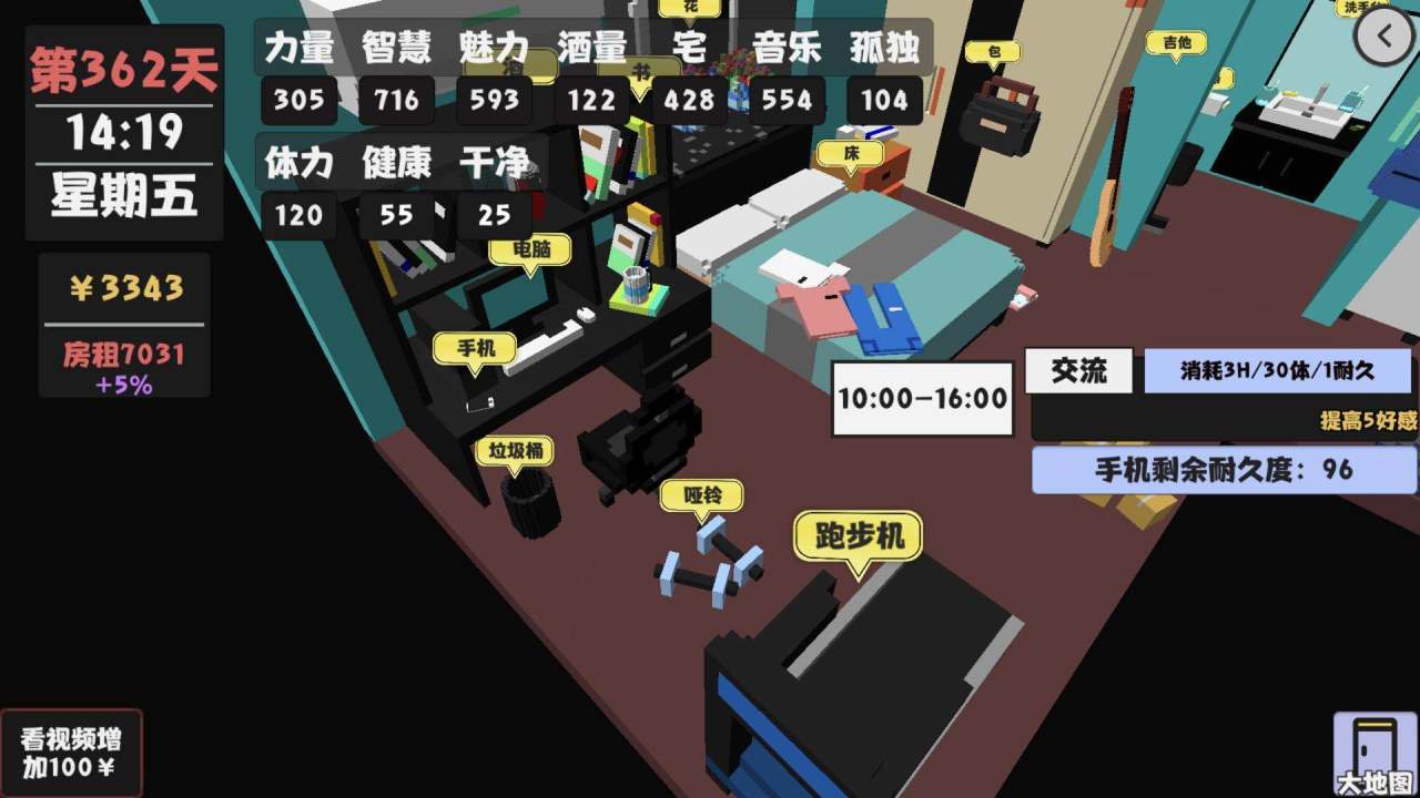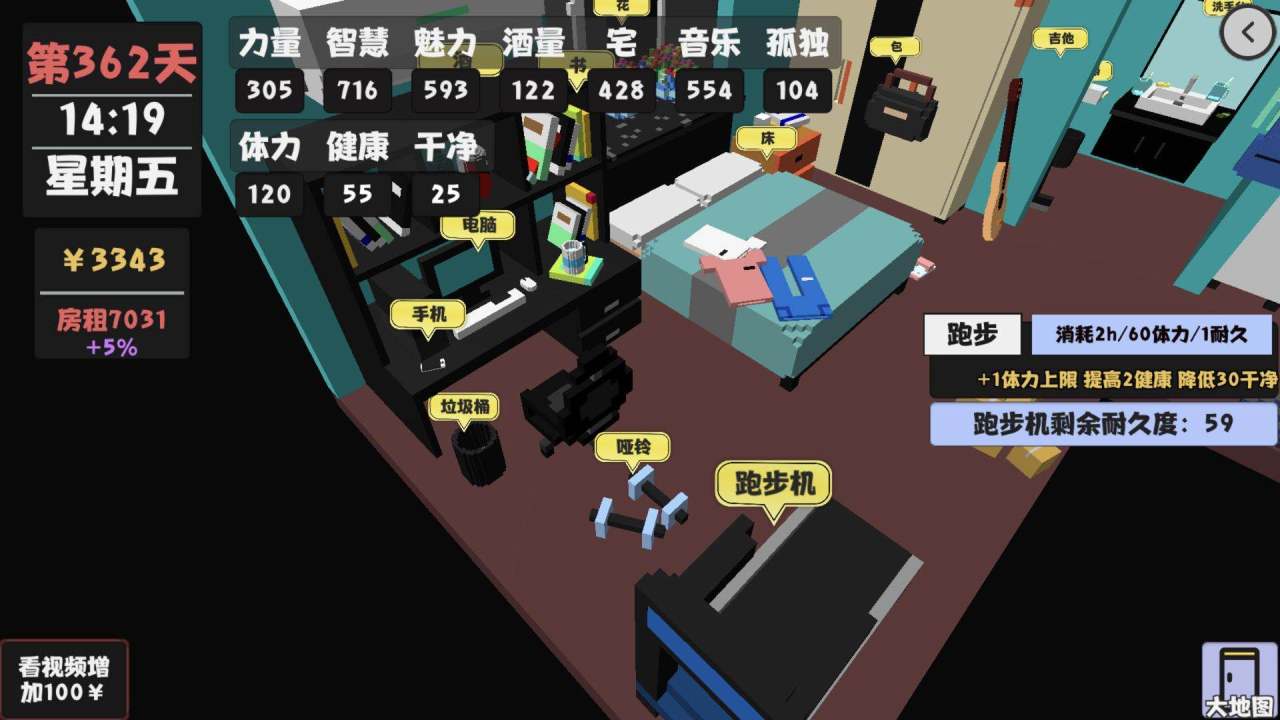 3.使用家里的跑步机增加体力值,这个做20次就够了,当体力值达到120点一天就可以做两次游戏开发,为第二个月赚钱打下基础。