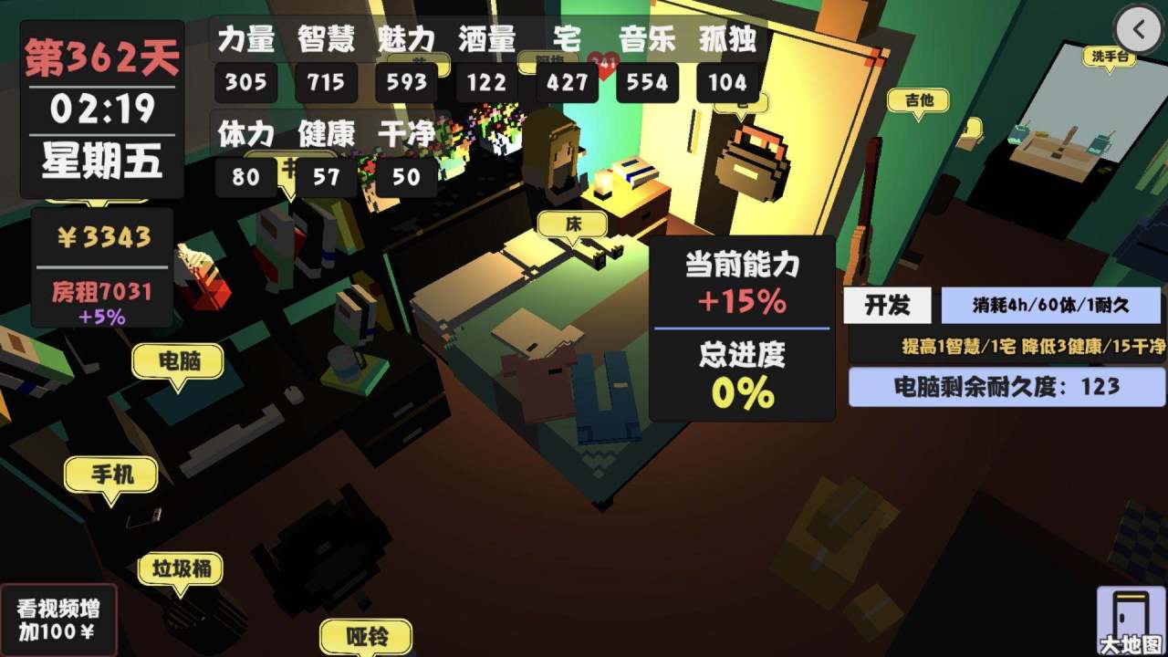 2.在30天之前一定要完成一款游戏的制作,除了打电话问钱其余的时候全部去图书馆看书或者看编程书,看编程书的话宅属性会上升,导致脱发。(智慧属性达到350点就可以不用看书和阅读了)