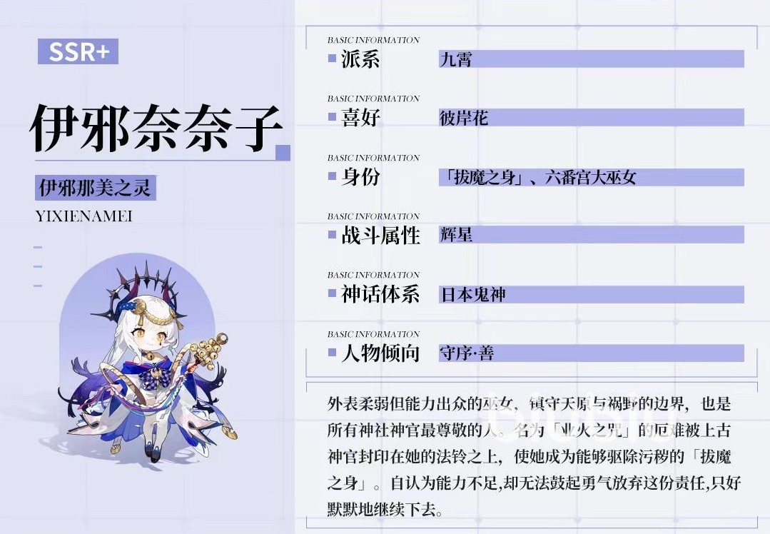 在游戏的背景故事中,伊邪那美是彼岸的镇守者,是被上古业火选中的巫女,她拥有看似易碎的外表,但实际上却是连恶鬼都需要避退三舍的大巫女。在实战中这是一名冰系的输出式神,定位是法师,主要承担单体和群体输出角色的任务,具有较强的爆发和一定的控制能力。
