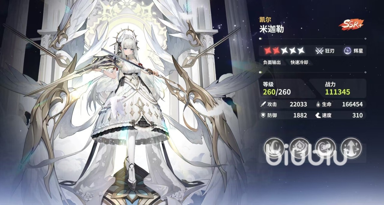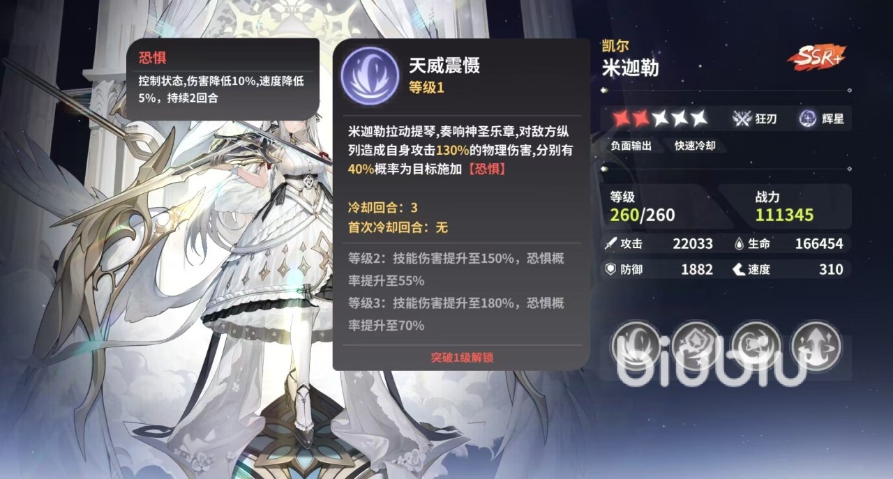 米迦勒的特点是带有负面输出效果以及快速冷却的优势,它是属于狂刃成员,自身品质为SSR+,是很多玩家手中可以作为主力的人选。第1个技能天威震慑,米迦勒拉动提琴对敌方纵列目标造成物理伤害,并有几率为目标施加恐惧效果,对方被恐惧之后造成的伤害降低,速度降低,持续两回合。这个技能第一次使用后没有冷却时间,后续使用有三回合冷却时间,提升等级之后,技能伤害和恐惧概率都会得到提升。