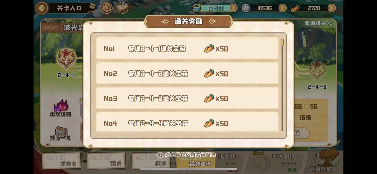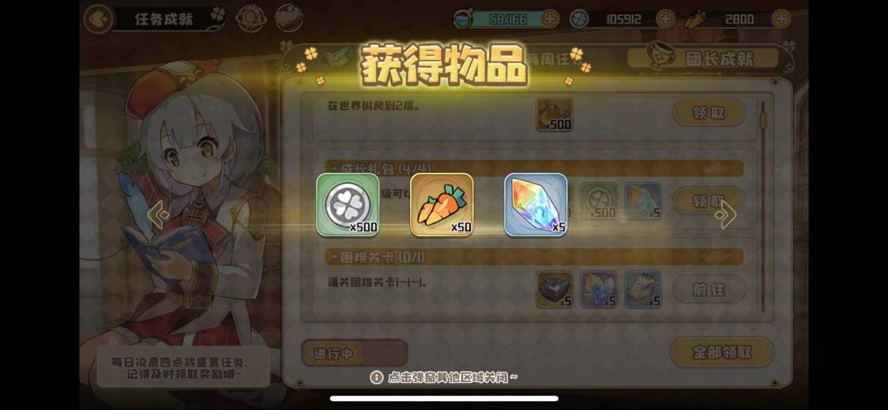 在主线任务中每完成一个关卡都可以获得50个萝卜,在左上角的小宝箱上面点一下就可以领取,大家千万不要忘记了啊,前期主线还是比较好推的,多多打主线收集萝卜,也可以解锁更多游戏内的功能,还是比较好的。