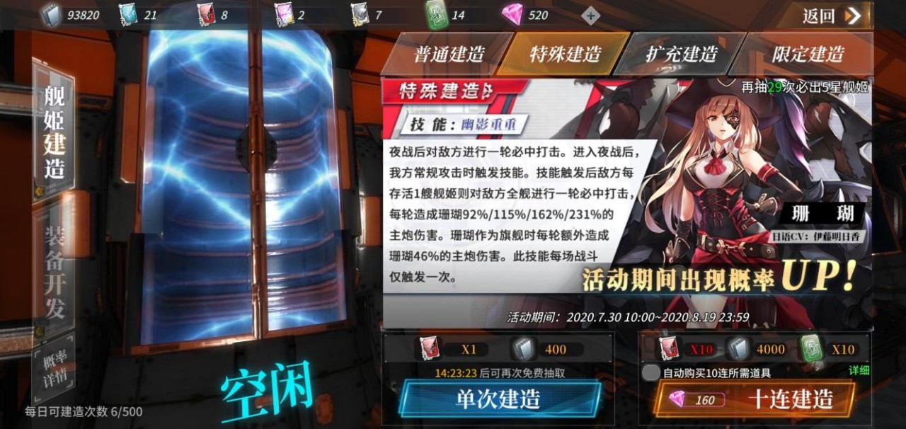 在获取方式上,我们是通过一个叫建造的方法进行抽卡,来获取基隆的。大家只要选择空闲的建造位就可以开始了,建造方式分为普通、特殊、扩充、限定建造四种,不过并不是一次性解锁的。