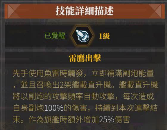 这里每个舰娘都有一个自己的专属技能,基隆的技能叫雷鹰出击,当玩家先手触发鱼雷的时候还能给副炮补充能量,并立即召唤两架直升机,自动造成副炮相同的伤害,直到连击结束,续航能力和伤害还是很可观的。