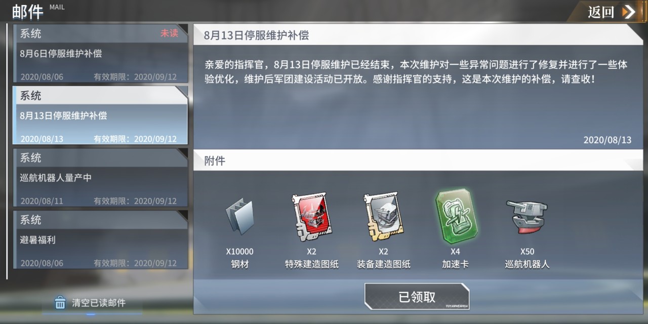 玩家也需要格外关注邮件的消息,因为系统还是很大方的,每次停服都会补偿4张加速卡。