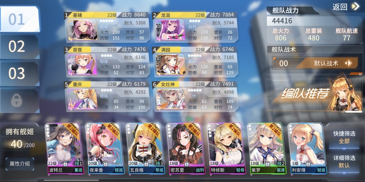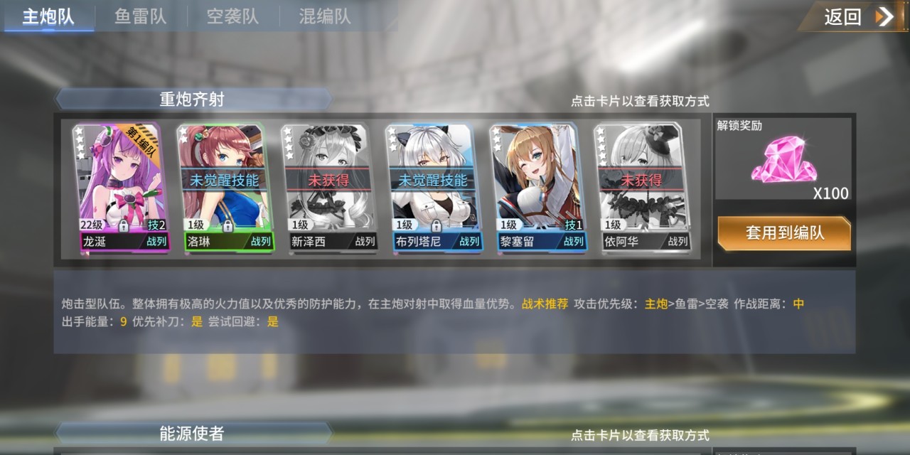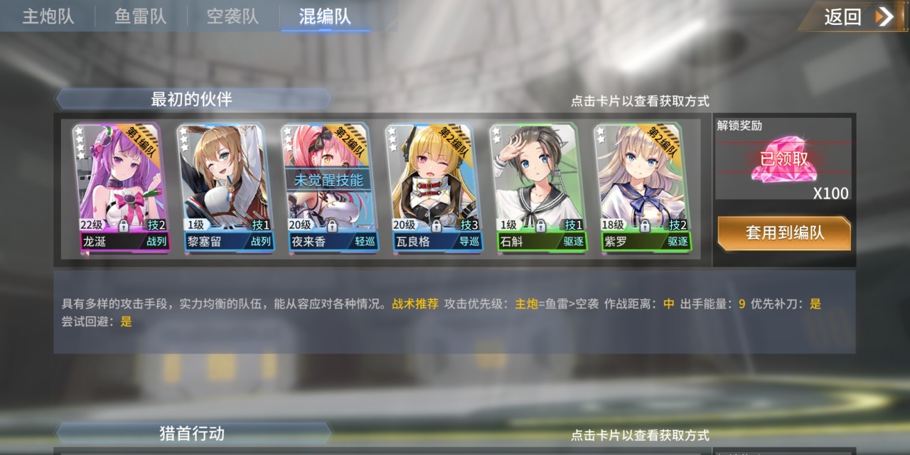这一种对于等级较低的新手玩家很有用,因为新手玩家获得的舰姬都是各种各样的,很难在短时间内凑齐一个功能都一样的队伍。每个队伍需要六位舰姬来工作,而混编队就是将功能不同的舰姬们聚集在一起。