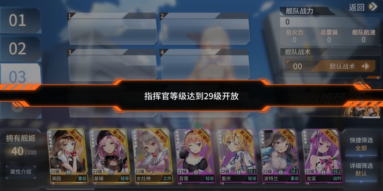 在混编队派遣两个战列,两个驱逐,以及一位轻巡和导巡的舰姬,每胜利一关,该关战斗的舰姬都可以得到等级提升,以及亲密度的升高。如果队伍的战力较低,则可以升级装备。