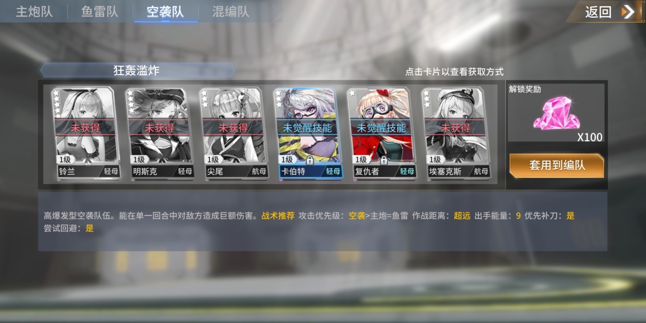 空袭队由四个轻母和两个航母组成的一支空中队伍,属于高爆发型空袭队伍,每次战斗可以在单一回合中队敌方造成巨额伤害,并且作战距离可以达到很远,对于擅长空投的敌人,空袭队是一个很好的选择。