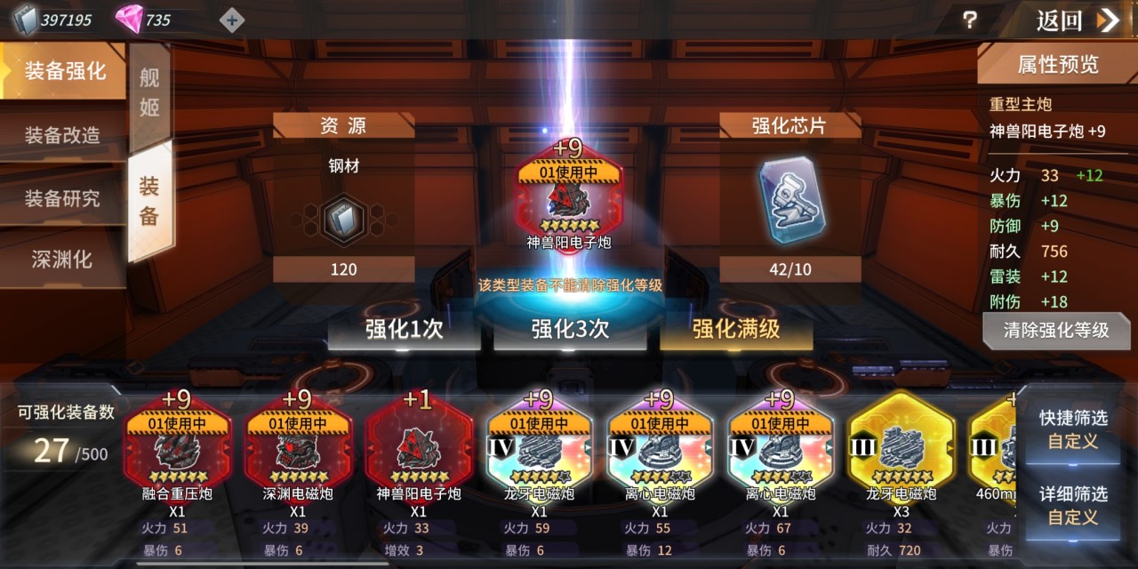 强化武器不管对于什么队伍都是必须的,每次武器的强化可以让队伍的战力大幅度的提升,所以玩家可以尽可能地去收集强化芯片,可以通过做任务以及过关卡得到一定的数量,每次强化需要消耗十个强化芯片,每个武器最高强化程度是+9。