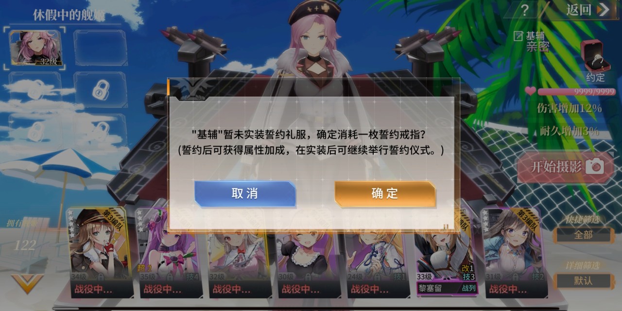 在最后,小编要提醒大家,在选择使用誓约之戒的对象时,应该先到时装里看一下,是否存在誓约礼服,不然会无法进行誓约典礼,一直要等到该舰姬出相应的时装,相当于誓约之戒白用。