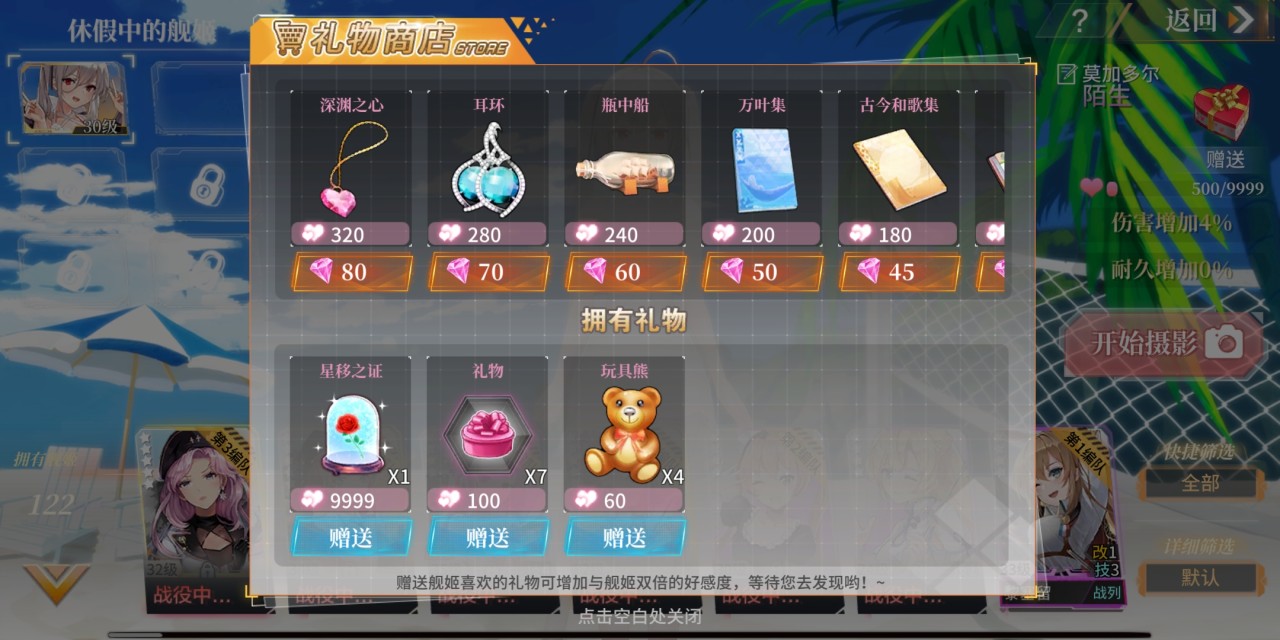 另外,如果迫不及待想要与喜欢的角色使用誓约之戒的时,可以采取送礼物的方式,增加好感度,或是多去刷关卡获得小礼物。