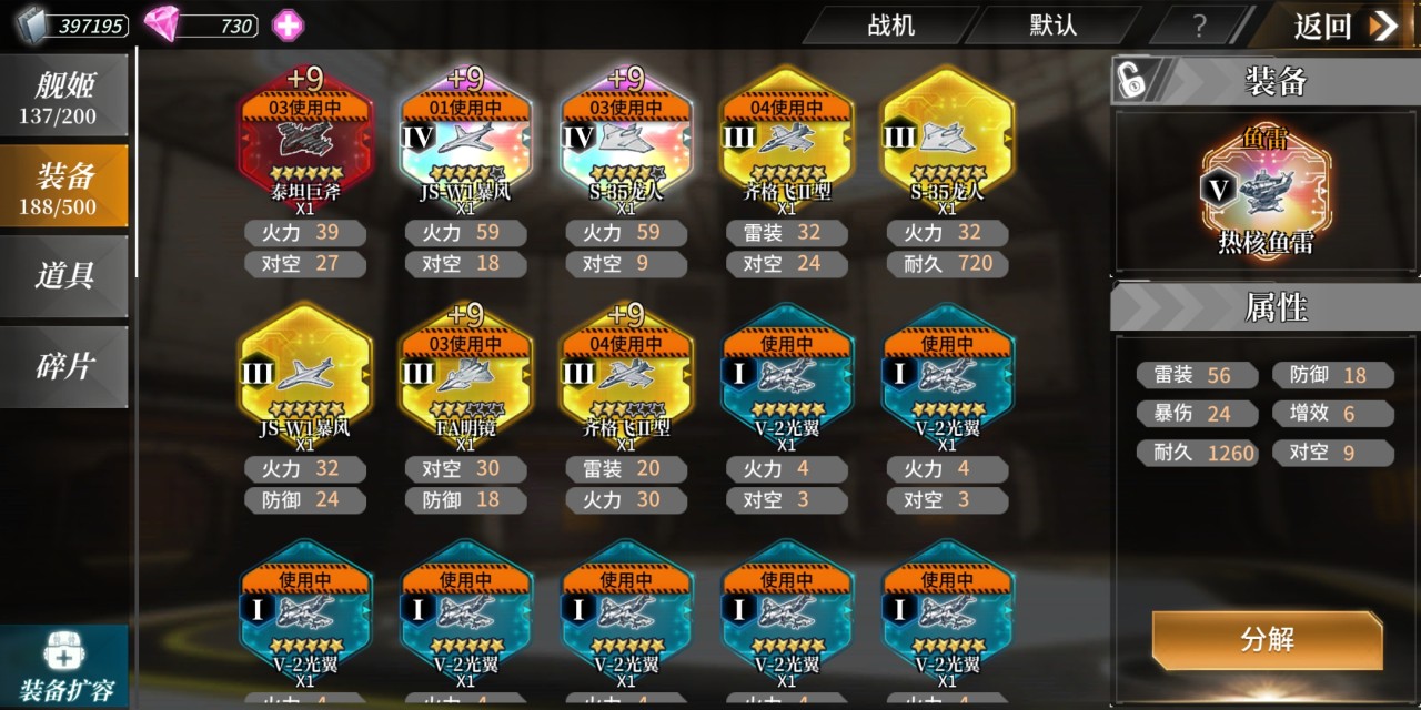 全部战机是航母的必备装备,一共可以装载两个战机,而两个战机也就是所谓的轰炸机,这也是为什么空袭队里航母必不可少的原因。除了主炮的攻击,在面的敌人的空袭的时候,玩家也需要派出一定的战机对地方进行空袭。