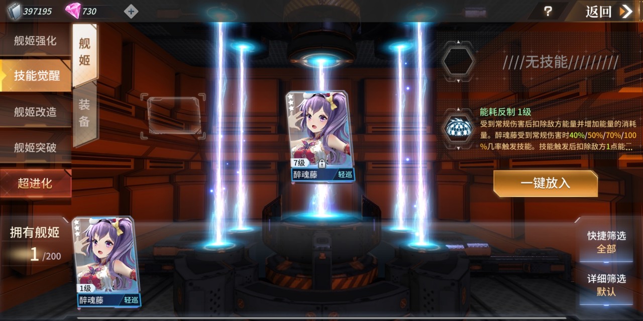 其次,达到等级只是解锁技能这个功能而已,舰姬的技能解锁还需要进一步操作。当玩家进行ex难度的时候,可以看见奖励就是不同属性的舰姬,可能很多玩家会将得到的这些舰姬分解,这就浪费了。利用巡航机器人来获得奖励,可以在有概率解锁舰姬的技能。