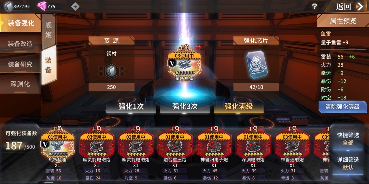 每个舰姬都会佩戴一定数量的装备,而这些装备等级越高,整个队伍的战力也就越高,在战斗的时候就可以快速获得胜利。如果装备的等级处于一般的话,玩家可以通过强化装备来提升战力,强化装备并不难,每次强化只需要消耗10张强化芯片。当装备强化到最大值时,武器的火力也会提升,从而在打第九章时更加容易。