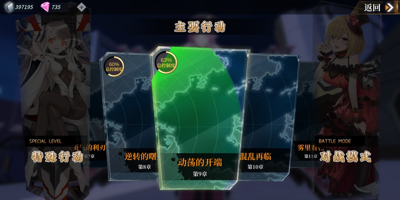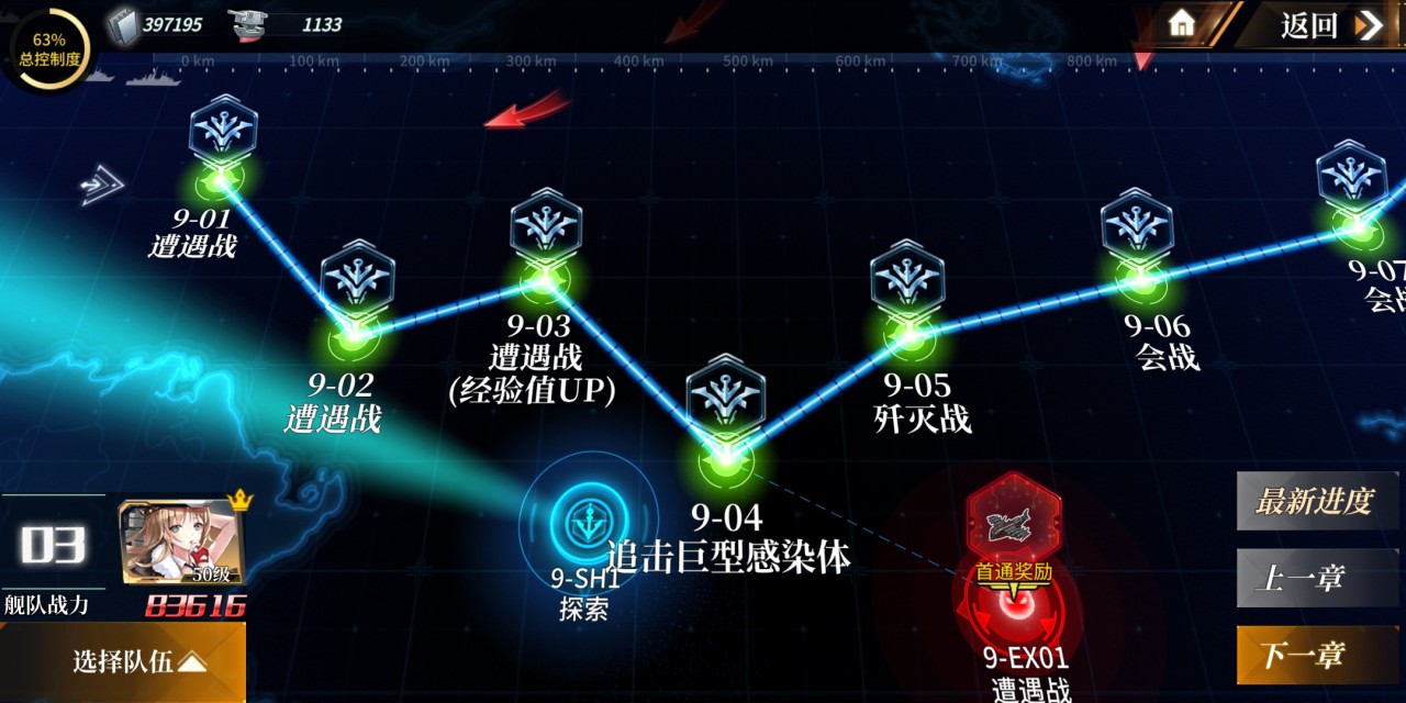 在第九章还有一点不同的就是,跑图的关卡在普通难度中出现了,前几章的跑图关卡一般只会出现在ex难度。关于第九章的跑图关卡,玩家可能会想跑S之后再去打怪,这是不怎么建议的。因为第九章的最后boss攻打是需要一定时间的,再加上分数的旁边会有鱼雷,所以玩家只需要跑到A就可以快速通关了。