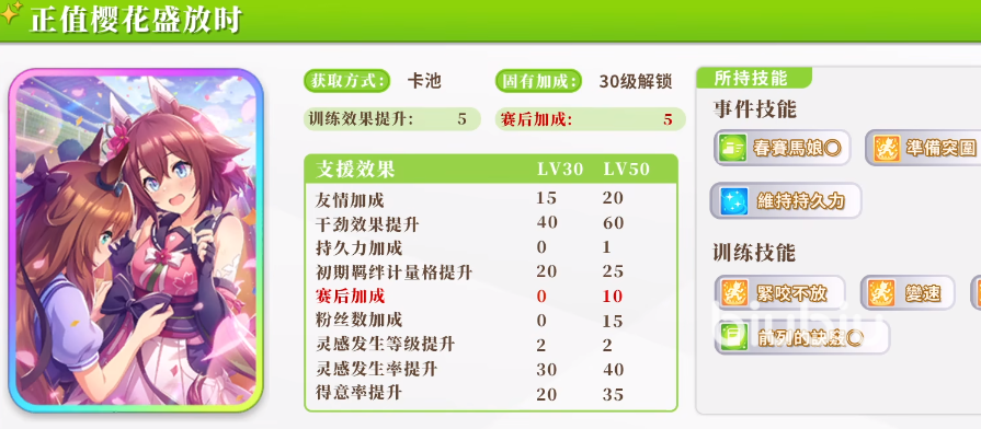 1、春马娘。春季比赛的时候速度稍微提升,绿色被动技能,消耗90PT,全场持续发挥。