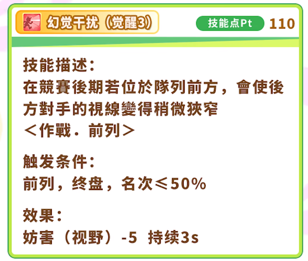 觉醒技能:魅惑术,初期竞赛如果处于队伍的前方,后边的赛马娘就会感到畏缩。幻觉干扰,竞赛后期如果处于队伍的前方,会使后方对手的视线变得略微狭窄。
