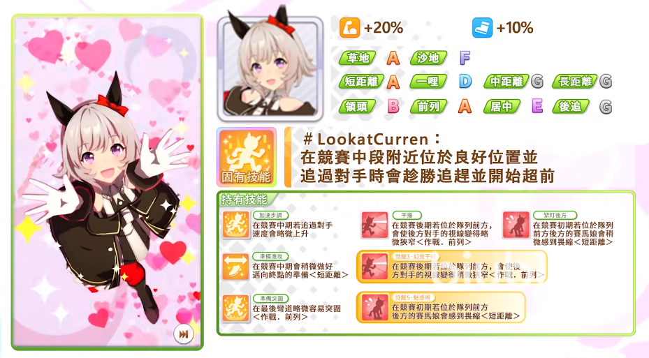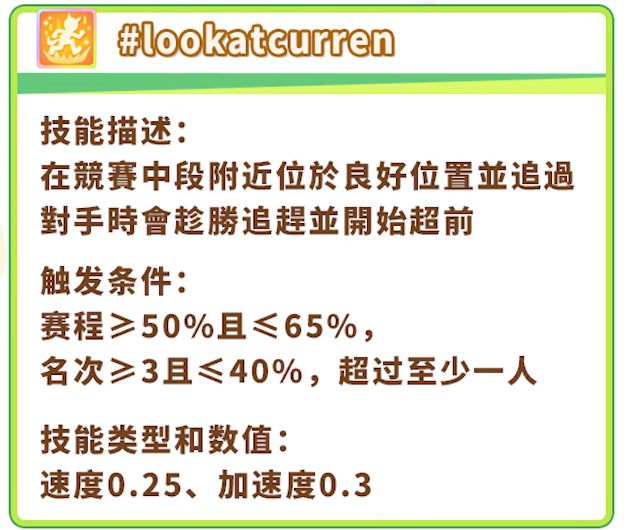 固有技能: Look at curren。在竞赛中段位置位于良好位置并且追过对手时,会乘胜追击并且开始超前。触发的条件是赛程区间在50%~65%之间,名次在第3名以上,并且小于40%超过至少一个人。技能速度0.25,加速度0.3。