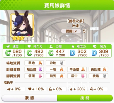 在闪耀优俊少女的游戏中,有一种特殊的玩法,这种玩法需要有着高强持久度和毅力的角色,米浴就很适合。等有机会,有资源去培养她的时候,记得注意她速度方面的提升,因为她自身的天赋速度很慢,其次就是强化自身的耐久度和毅力,养好了用来跑中长距离的话很适合。