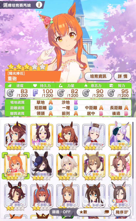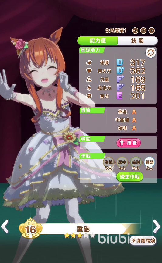 资质方面没什么好说的,跟原版一样。场地方面,草地A级距离方面,中距离和长距离双a标准,加上广泛的过于过分的跑法机制,逃马A级 先行A级,差马B级,追马B级。依旧是原来的那个熟悉的重炮,不过角色本身而言,主要还是跑先行居多,只要不是专门去刷专属名称,想必也没有多少玩家们将她在其他比赛中进行培养。