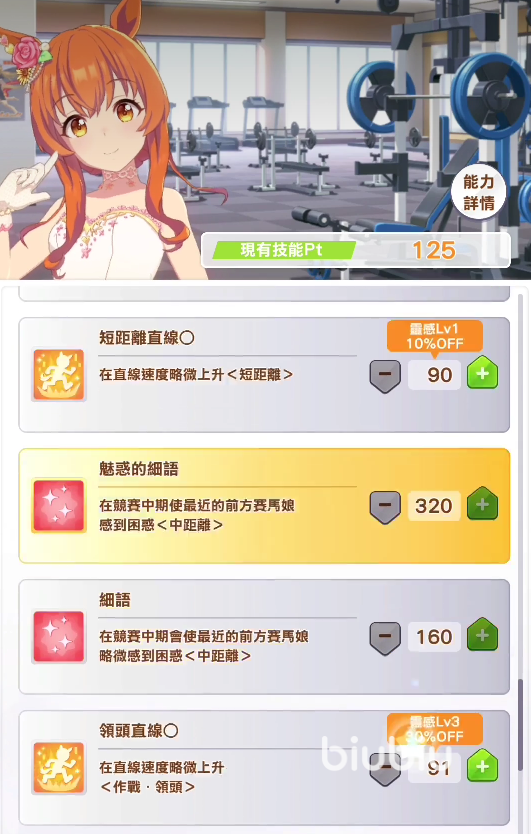其他技能方面,觉醒三会解锁魅惑的细语,在使用中距离比赛的情况下,让前期最近的一个前方角色感到困惑,使其产生妨碍效果,耐力恢复大幅度减少。以及觉醒五解锁的圆弧的艺术家,通用的传说技能非常好用的一个耐力恢复技能,传说级别的蓝色技能,其效果为,以最佳路线通过弯道的时恢复持久力。在弯道触发,大幅度回复耐力。