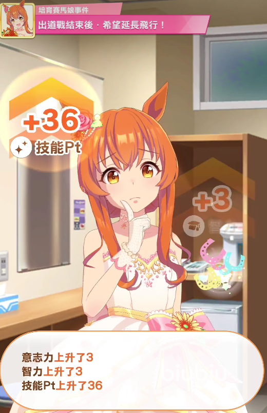 技能方面,大招技能花样纷飞的飞行演习。其效果为在最后弯道处,如果处于队伍前方,则追赶对手让速度提升。如果处于队伍后方的话,则追赶对手,让加速力得到提升。可以看出来,她的技能是为了切合角色多种多样的跑法而设定的。
