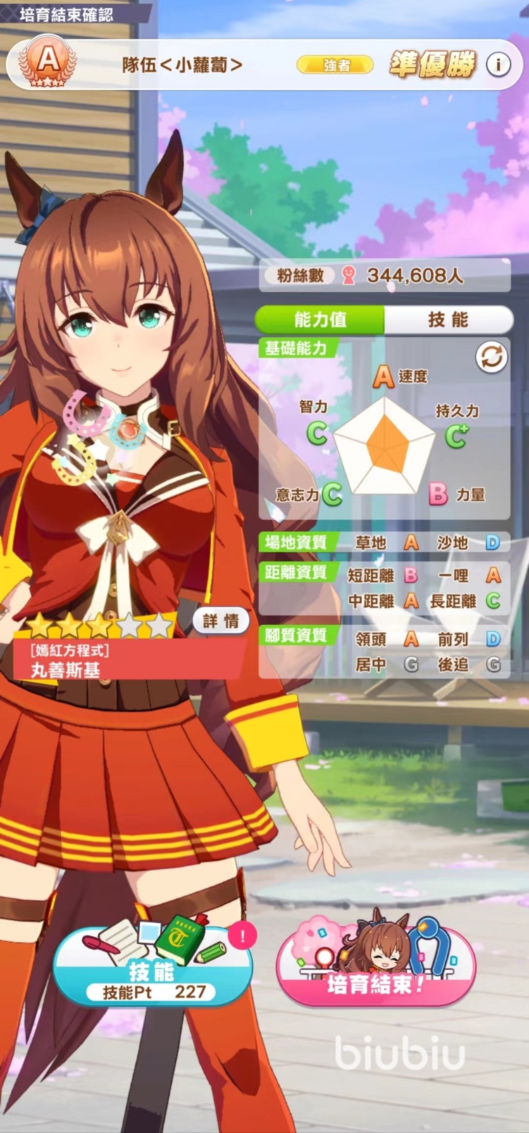 速度顾名思义就是跑的速度快慢,所以一定练得愈高愈好。不过要留意这里所示是的最高速度,而实际在比赛只会在最后尾盘,即最后阶段的时候才会跑最高速度,比赛中段的速度高低而是受智力影响。