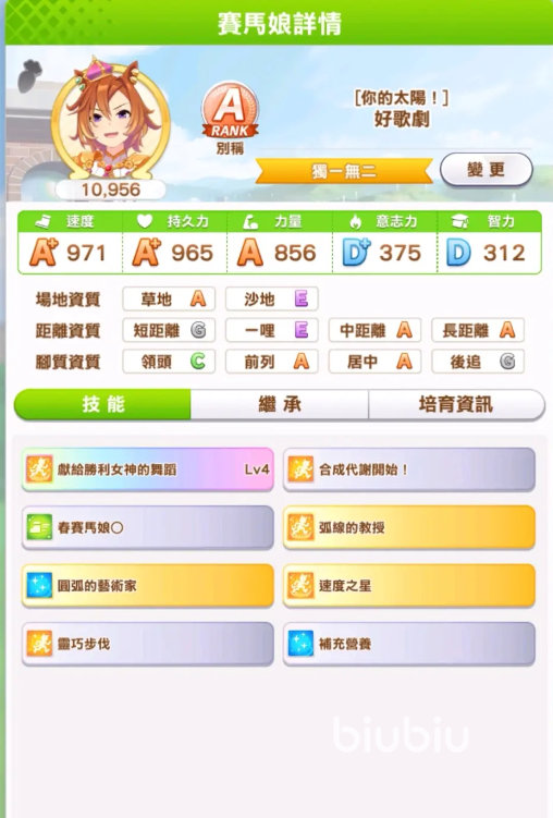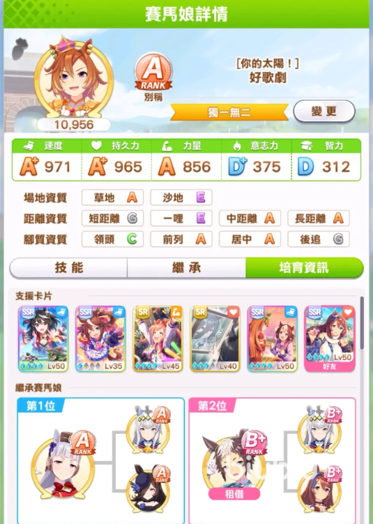 先来看看好歌剧的基础属性,首先中长距离的都是A,小编比较推荐培育成跑长距离的角色,脚质方面可以在前列或者是居中的位置,她固有技能在跑前列比较容易触发,所以培育的时候就按照长距离的前列角色培育就好了。