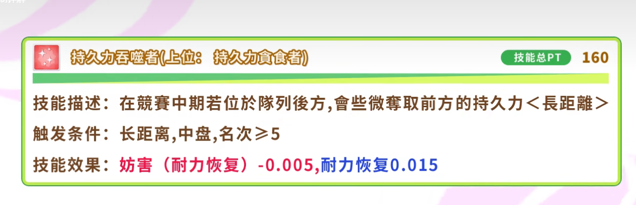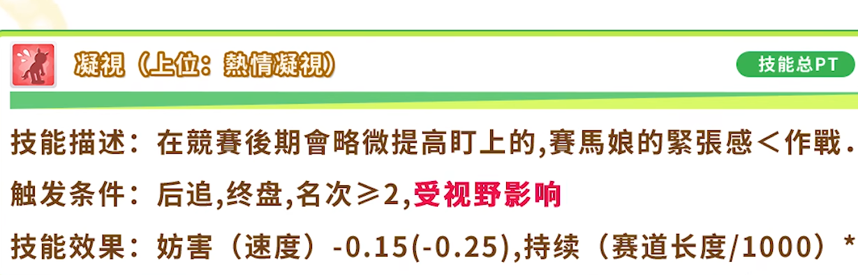 在目前所有的闸马技能里面,一共有两个技能是有着附带增益的效果,其实也是损人利己的技能。第一个技能是如果在比赛的中期,我方的优俊少女在地方的后面的话,会夺取前方的优俊少女的持久力,但这个技能只能长距离的比赛中才可以触发。