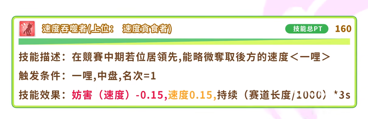 第二个技能则是在比赛的中期,如果我方的优俊少女一直都是处于领先的地位,那么便可以对后方的优俊少女的速度进行一定的夺取,同样这个技能也有着使用条件,条件便是只能在英里赛和中期才可以发动。
