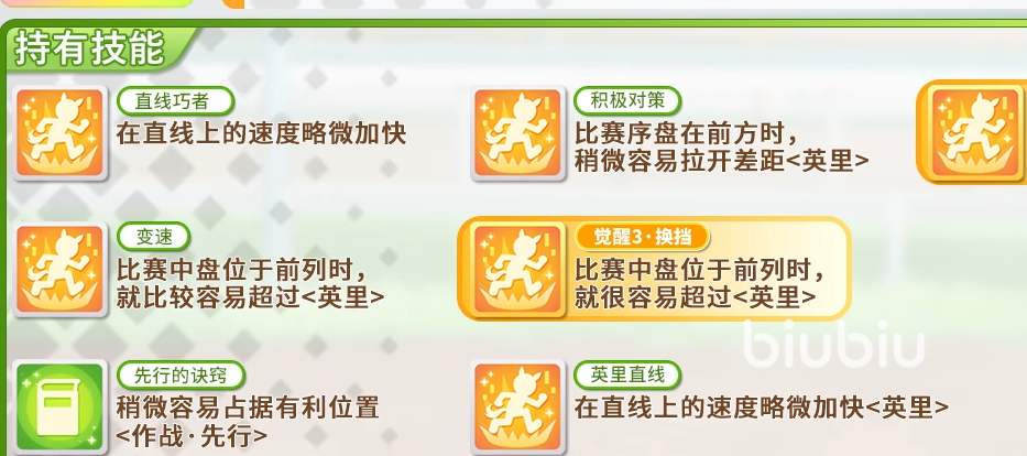 接下来介绍下大树快车的技能,她的初始四个技能分别为,1技能是在比赛序盘的时候,如果大树位于前列,那么在接下来的比赛里她更容易与对手拉开差距。但是这个技能只可以在英里比赛中触发。2技能,也是在比赛的序盘,如果大树位于前列的话,那么更容易扩大差距。这两个技能触发的概率都不低,而且效果可以叠加,但是只可以在英里赛中才可以触发。3技能是在直道的时候,速度会进行提升,但是只限于英里赛。
