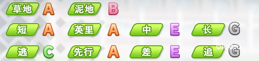 而在战术的适应性方面,大树快车本身的对于领先的跑法适应是C,前列跑法为A,居中跑法为E,后追为G。根据大树快车总体的参数来说,她适合的实以速度和力量为核心的培养路线,因为大树本身的最擅长的是前列的跑法,所以培养的其他方式也是以前列为基础的培育方式。而且因为本身属性的关系,后期的培育任务里面,关于毅力和体力的培育任务越比较容易完成。因为大树本身对于沙地的跑法并非很适应,所以玩家们尽量提高她沙地的耐性,这样之后的比赛里遇到沙地才不会出现降速的情况。