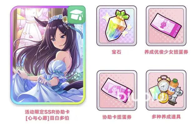 奖励方面的话,完成活动抽卡之后便可以获得限定的活动称号(花开少女JunePride),以及活动限定ssr协助支援卡花嫁目白多伯,是一个具有活动特色的ssr稀有度智卡,可以作为日后各位角色育成环节,当做智卡选择之一。