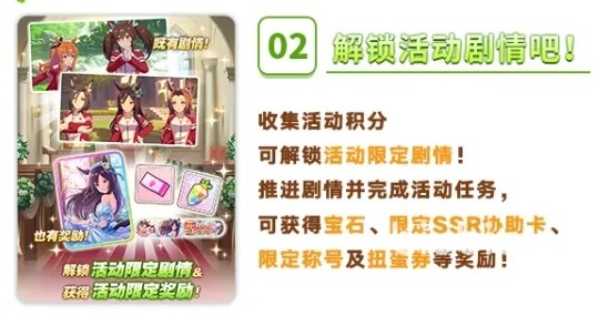 当活动积分达到一定程度之后,便可以解锁限定的活动专属剧情,并持续推进活动任务。获得更多宝石,以及高稀有度支援卡和限定称号等奖励。简单来说,就是前期比较常规的以攒积分抽转能为主的玩法。