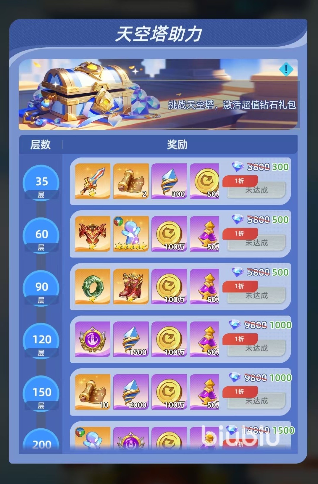 除了每层固定的奖励之外,为了提升玩家的成就感和收益,每通关5层可以额外解锁一次额外的宝箱。该奖励的覆盖面非常广,除了进阶石、钻石之外,还有稀有英雄装备和英雄碎片等核心资源。这使得玩家在短期之内有了更小的目标,即使无法长距离爬塔,也需要尽量冲满下一个宝箱奖励。可显著提升投入的回报率。当玩家通关达到指定的里程碑层数时,还可解锁天空塔助力相关的礼包,这类礼包需要钻石购买,包括稀有装备、养成资源、黄金契约和其他一些关键的道具。如果手中有额外的钻石,这些礼包都不要错过。